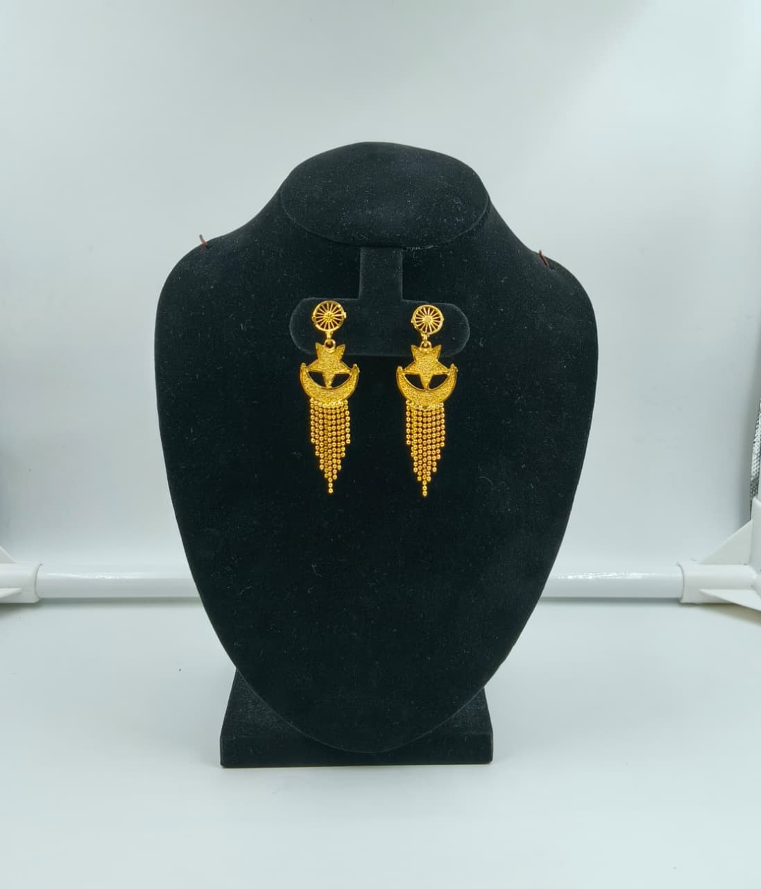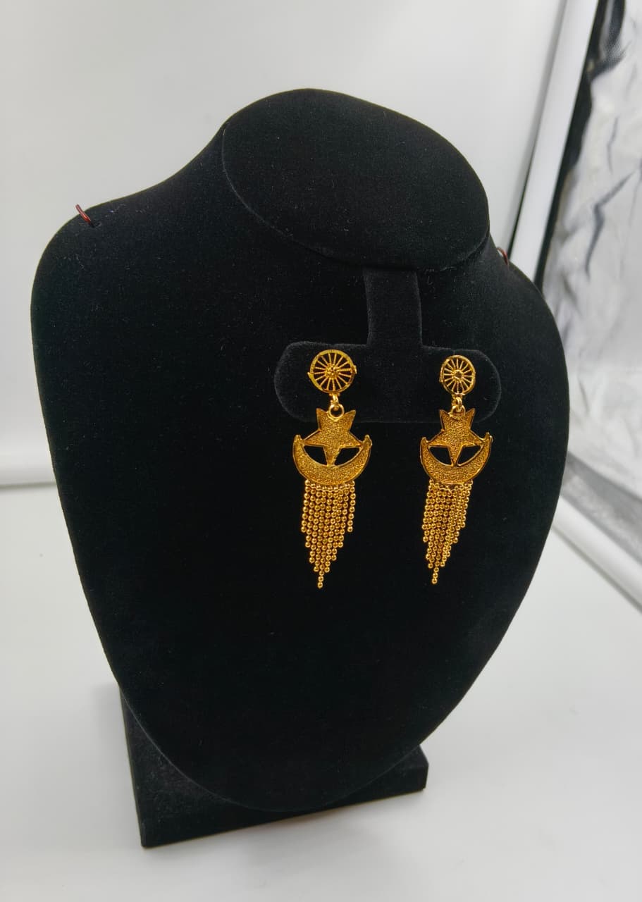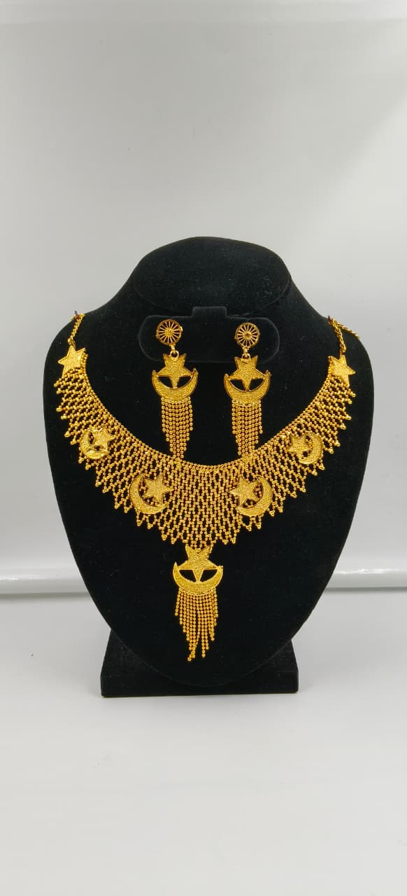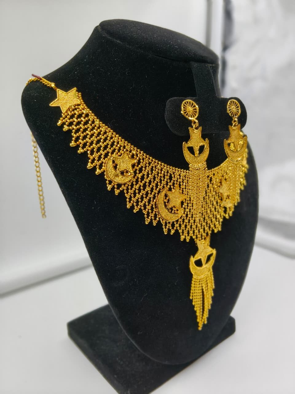 Enhance your traditional look with this Elegant Gold-Plated Necklace Set, designed to add charm and sophistication to your outfit. This stunning set includes a beautifully crafted necklace and a pair of matching earrings, making it a perfect choice for special occasions.The intricate design features a unique star and crescent pattern with detailed chain work, giving it a rich and premium appearance. Lightweight and comfortable to wear, this jewelry set is ideal for long events like weddings and celebrations.