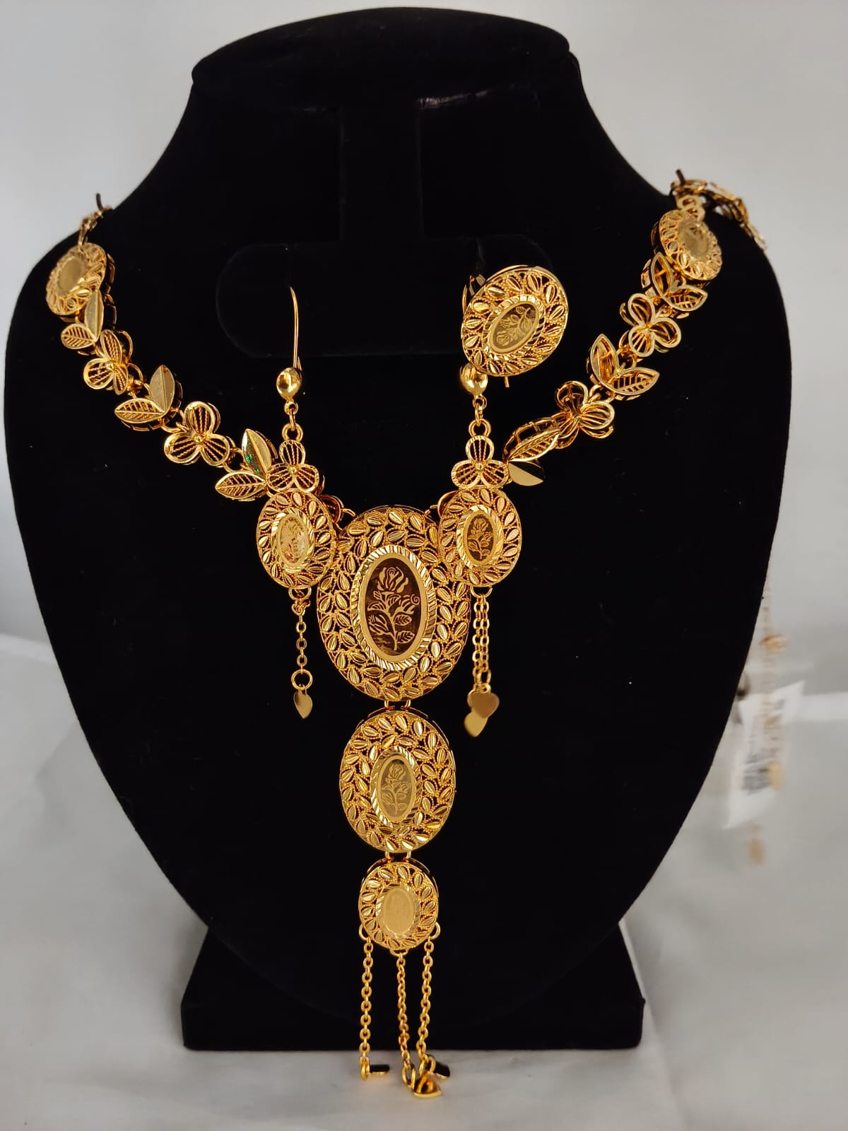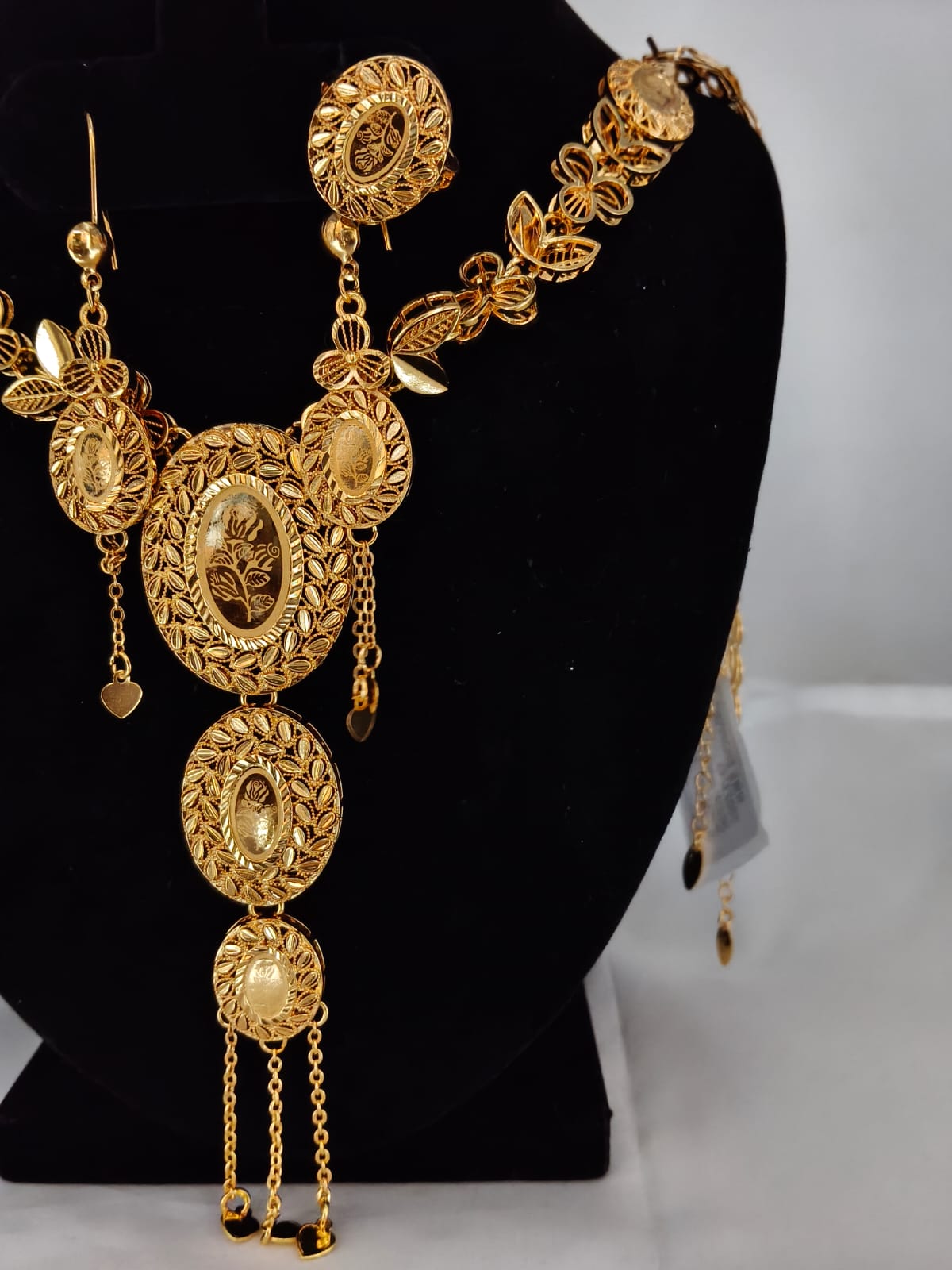 Elevate your traditional style with this stunning gold-finish necklace set featuring beautifully crafted oval and floral motifs. The necklace showcases a rich, detailed design with layered oval pendants, highlighted by intricate carvings and a bold central piece. Delicate chain drops with tiny heart accents add a graceful touch, creating a perfect blend of elegance and charm. The matching earrings complement the necklace, making it an ideal choice for festive occasions, weddings, and special events. This set pairs beautifully with sarees and ethnic outfits for a complete traditional look.