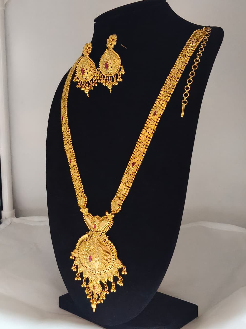 Traditional gold plated combo set with short necklace + long haram. Features matching peacock pendant, ruby & green stones, and gold bead drops. Perfect for bridal layering & Muhurtham.