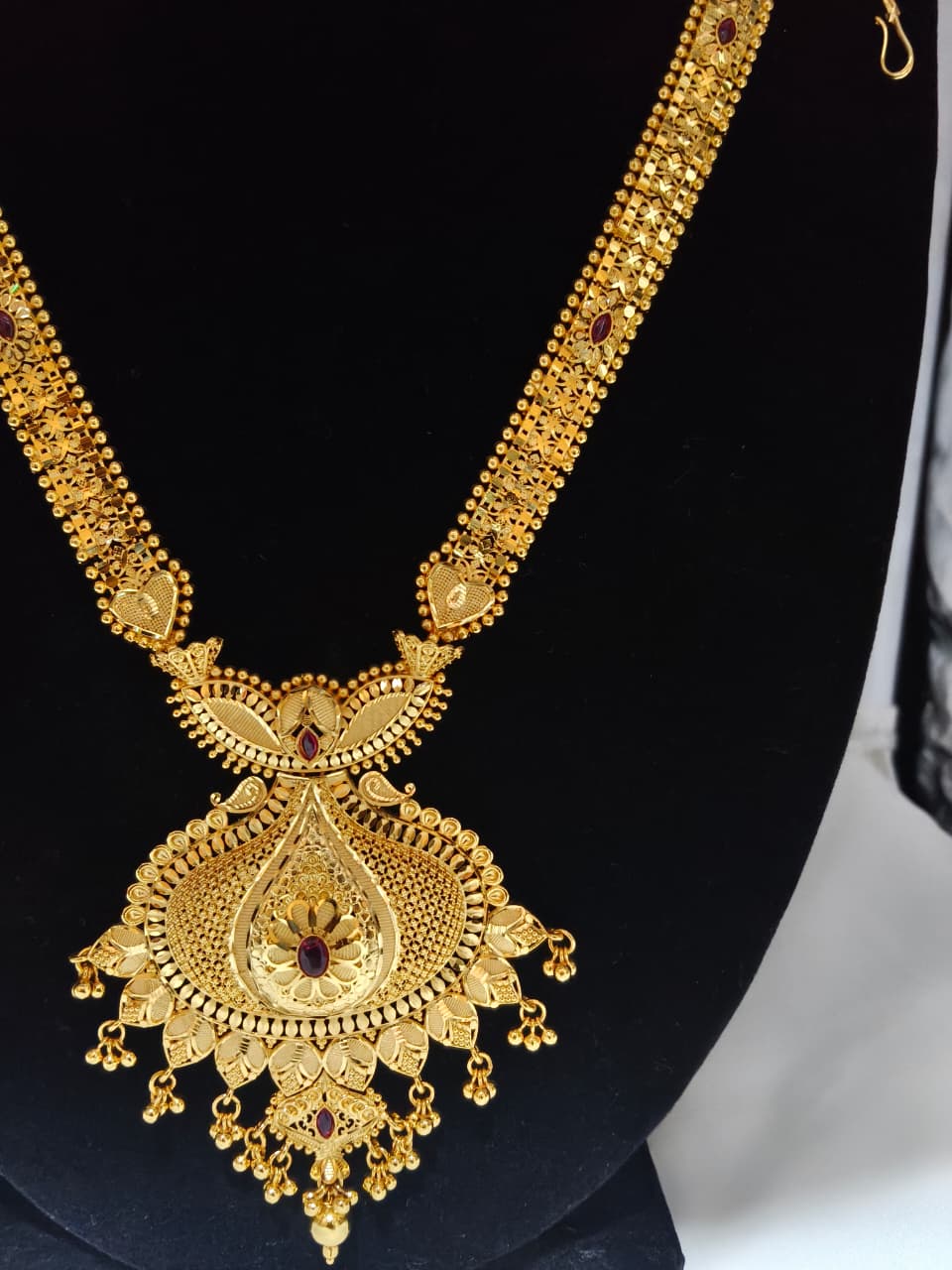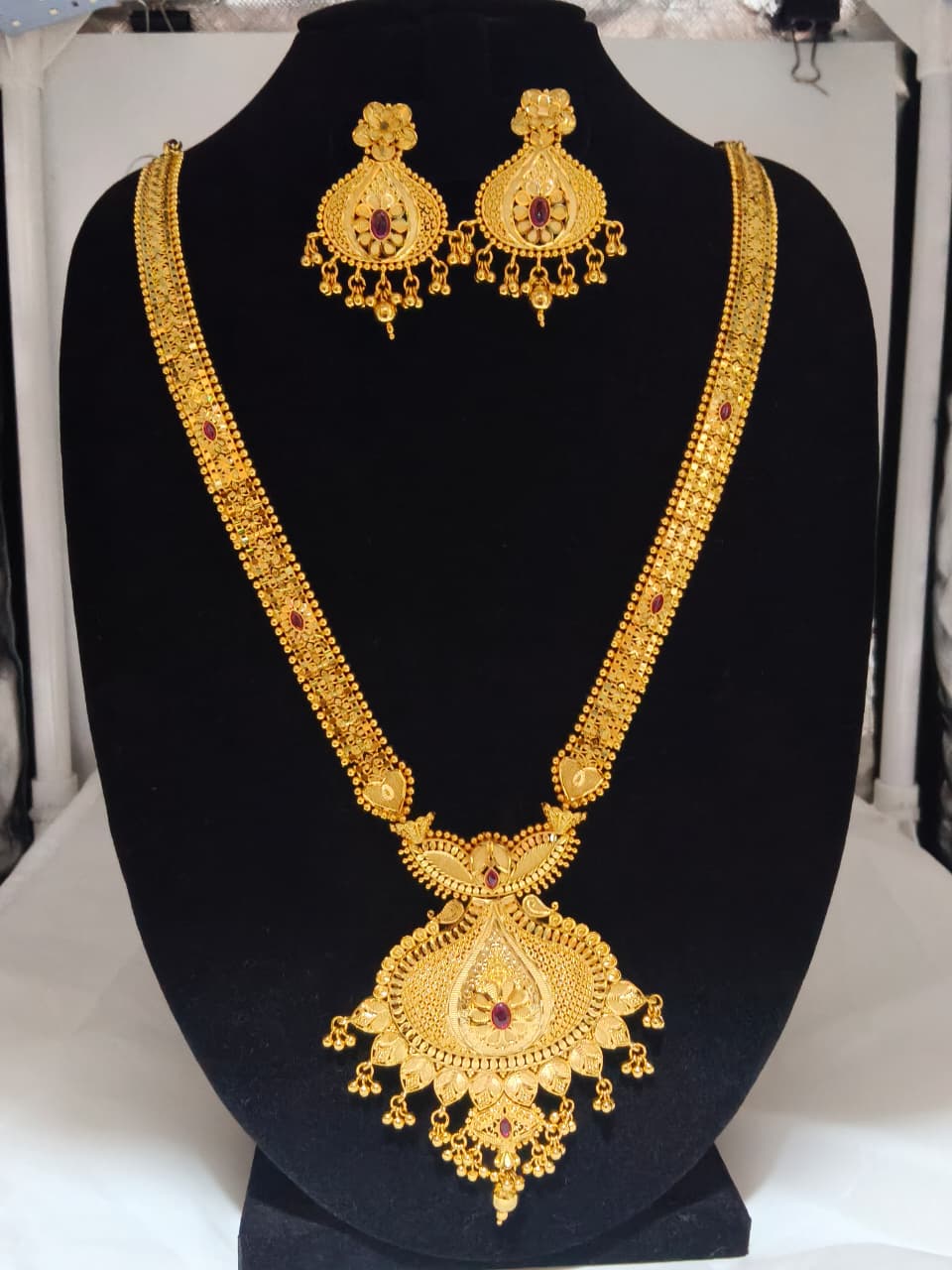 • Pendant: Heavy round pendant with peacock motif, dense jaali work, and ruby red + emerald green stone detailing