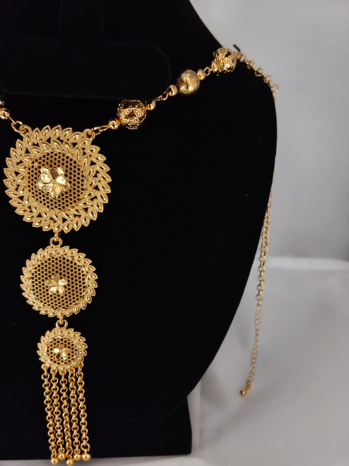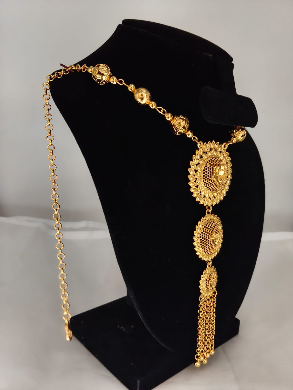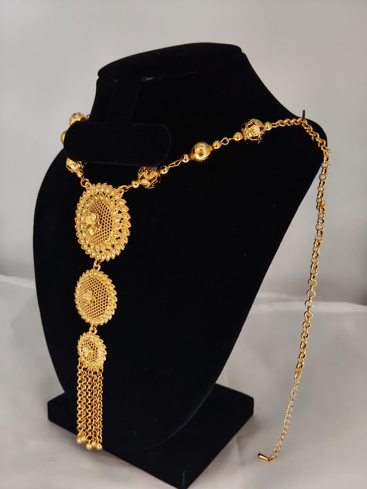 Chain: Decorative gold beads with floral carving on both sides + adjustable back chain