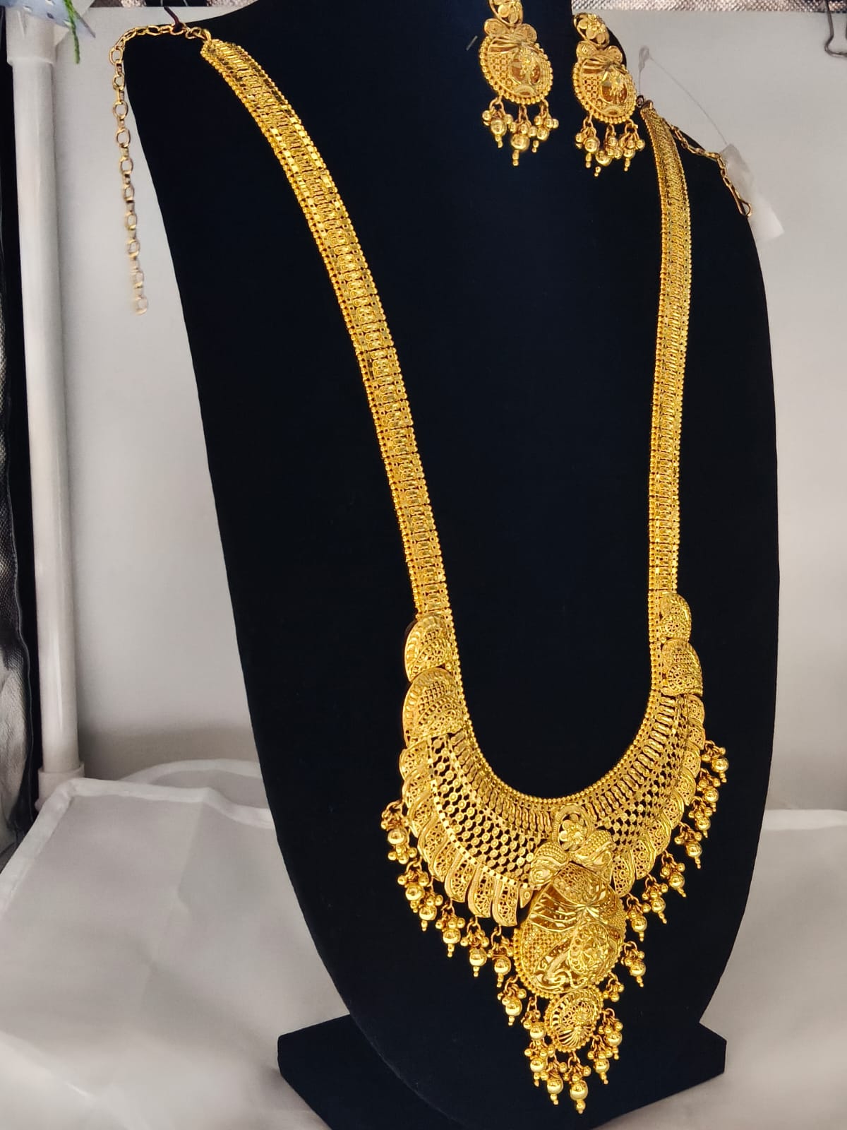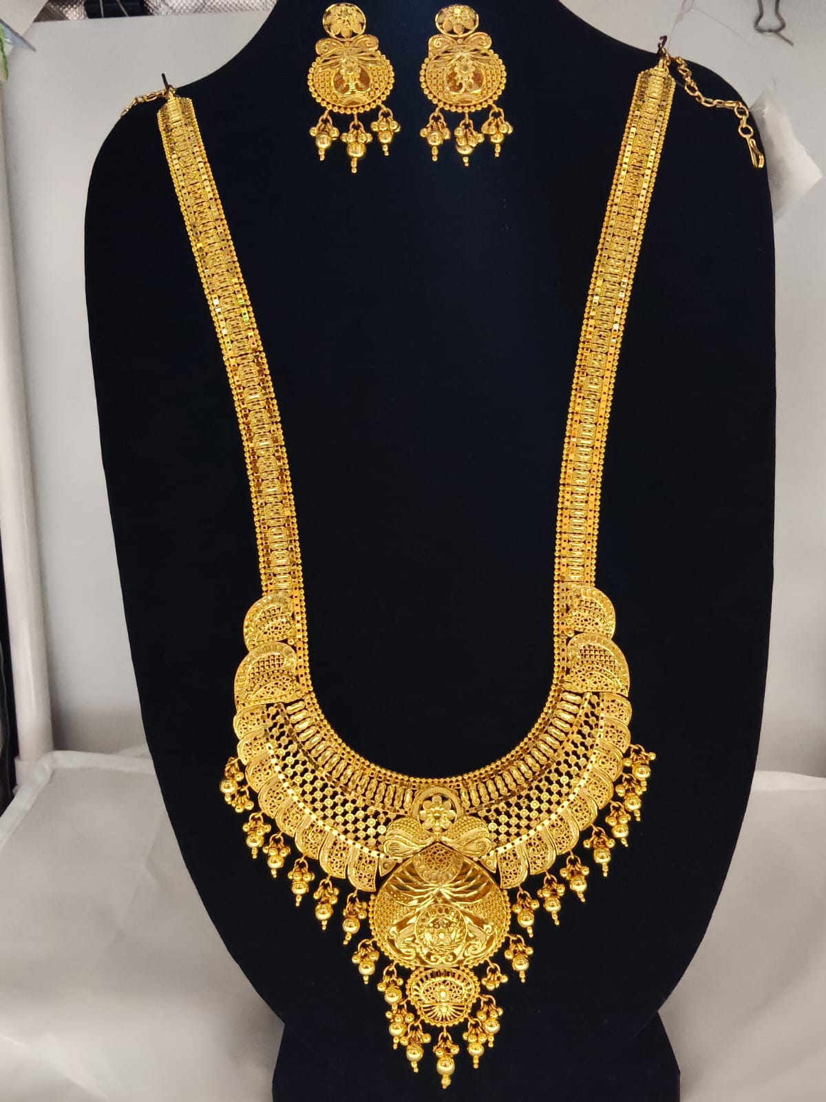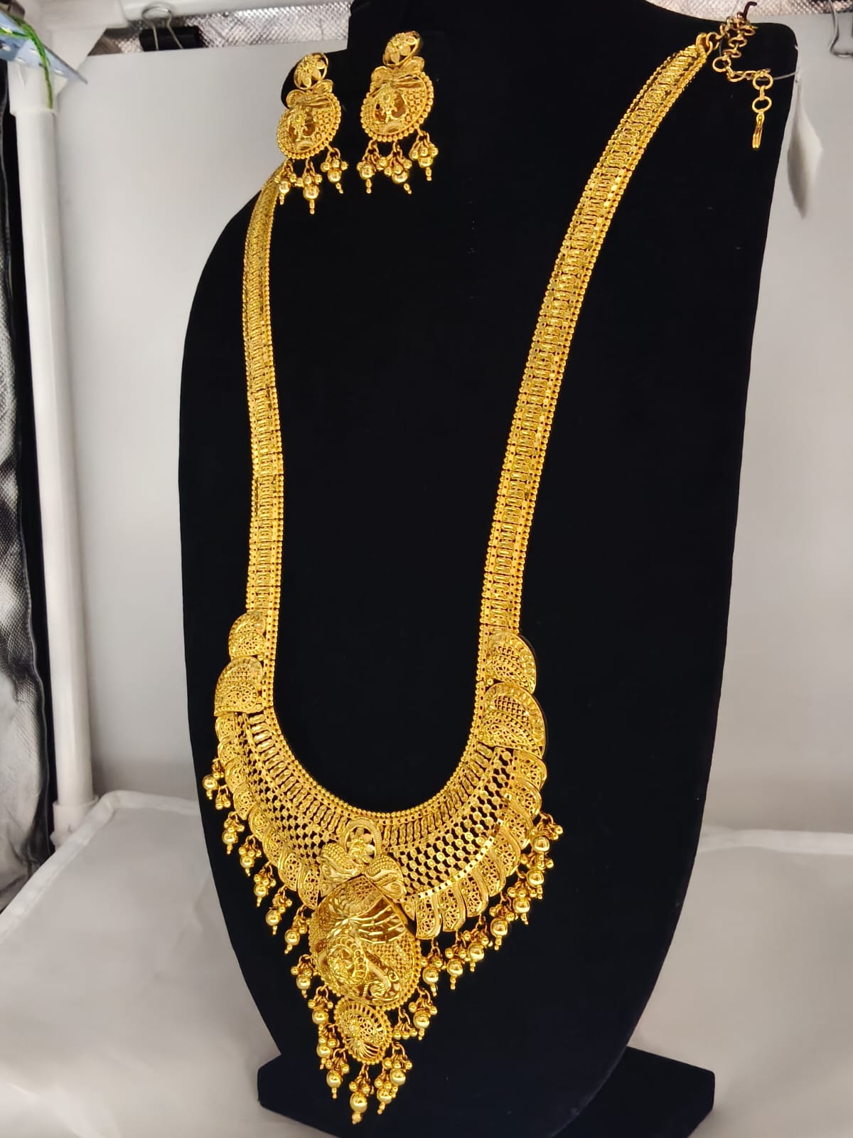 Traditional Gold Plated Heavy Bridal Long Aaram Set with Earrings